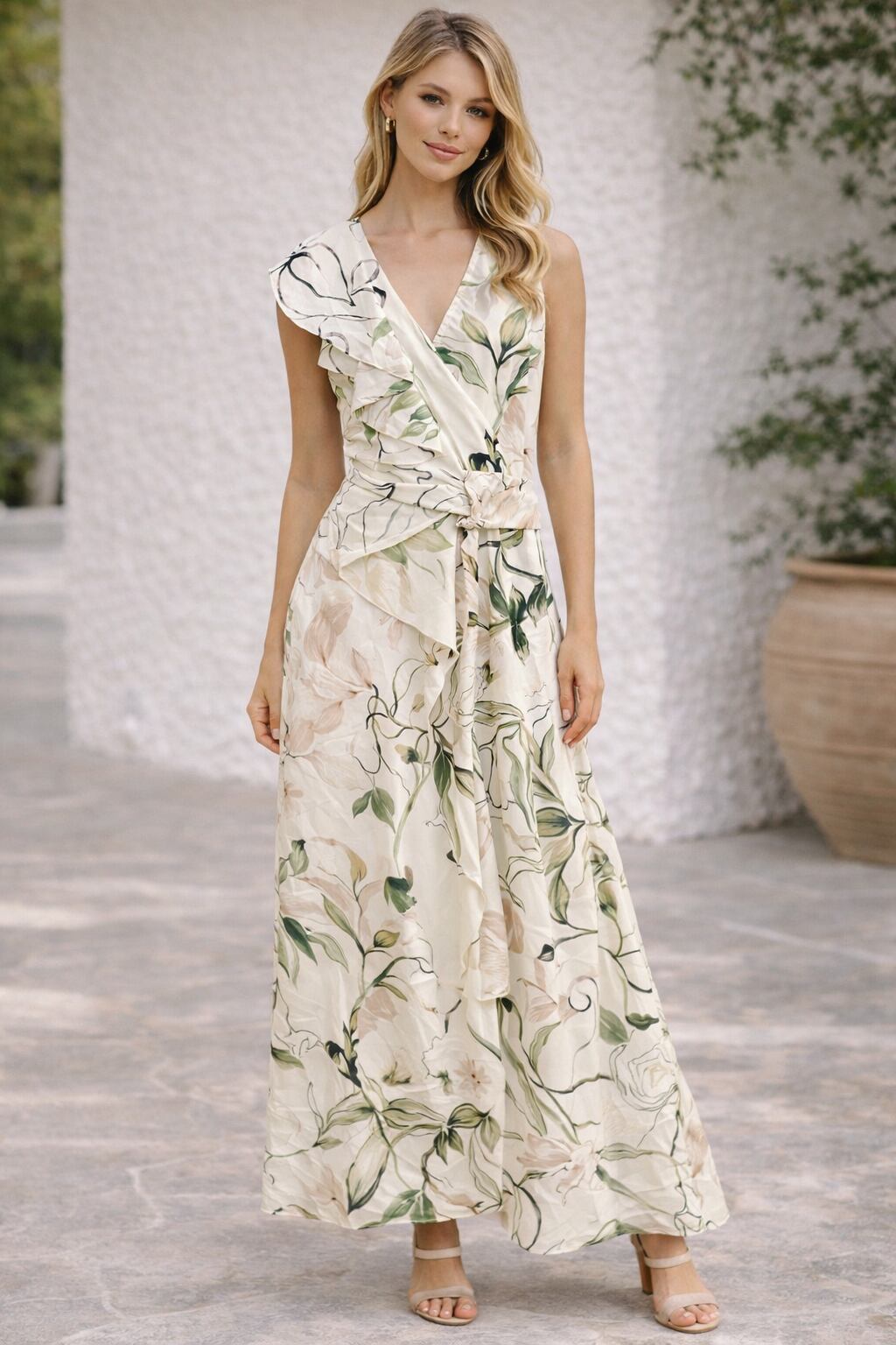 女性らしさと洗練されたシルエットが際立つロングワンピース。
