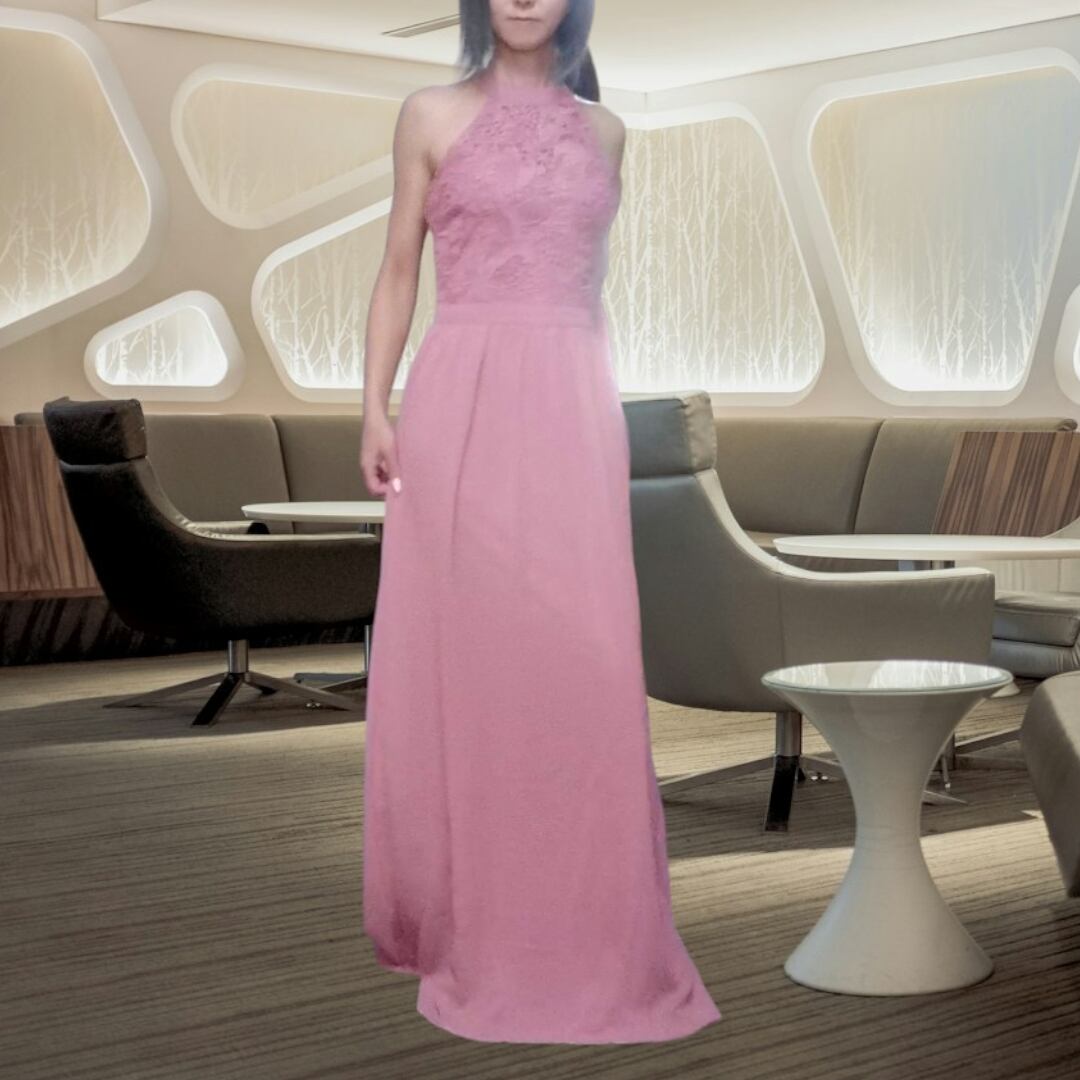 エレガントなレース素材を使用したホルターネックのマキシドレス。特別な日にぴったり